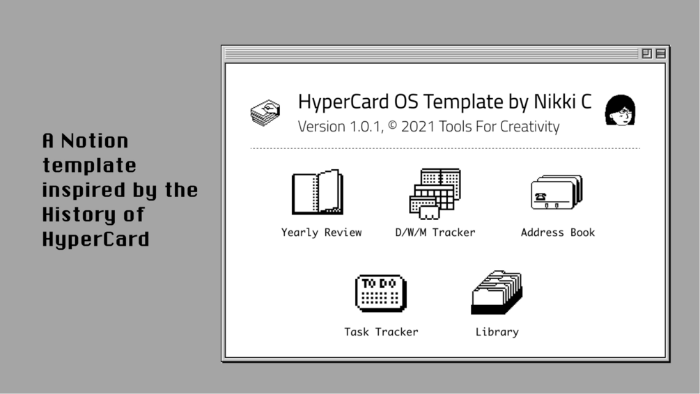 The full HyperCard OS Template for Notion, a reference manual + video walkthrough + all future versions and source files for all the icons, cover art & fonts used.
